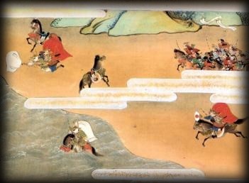 馬上から弓を構えれば錦の脛当てに波しぶきが飛び、黄金作りの太刀が光る。
