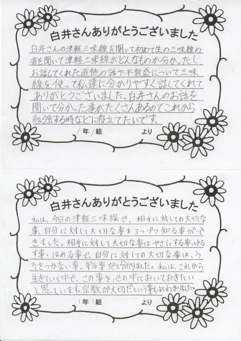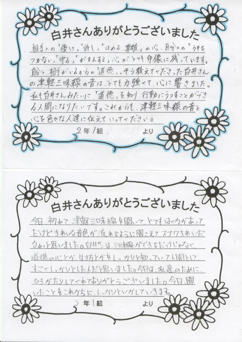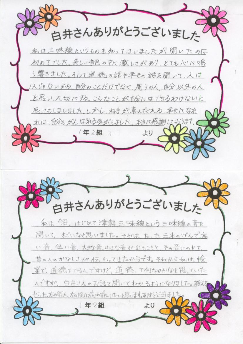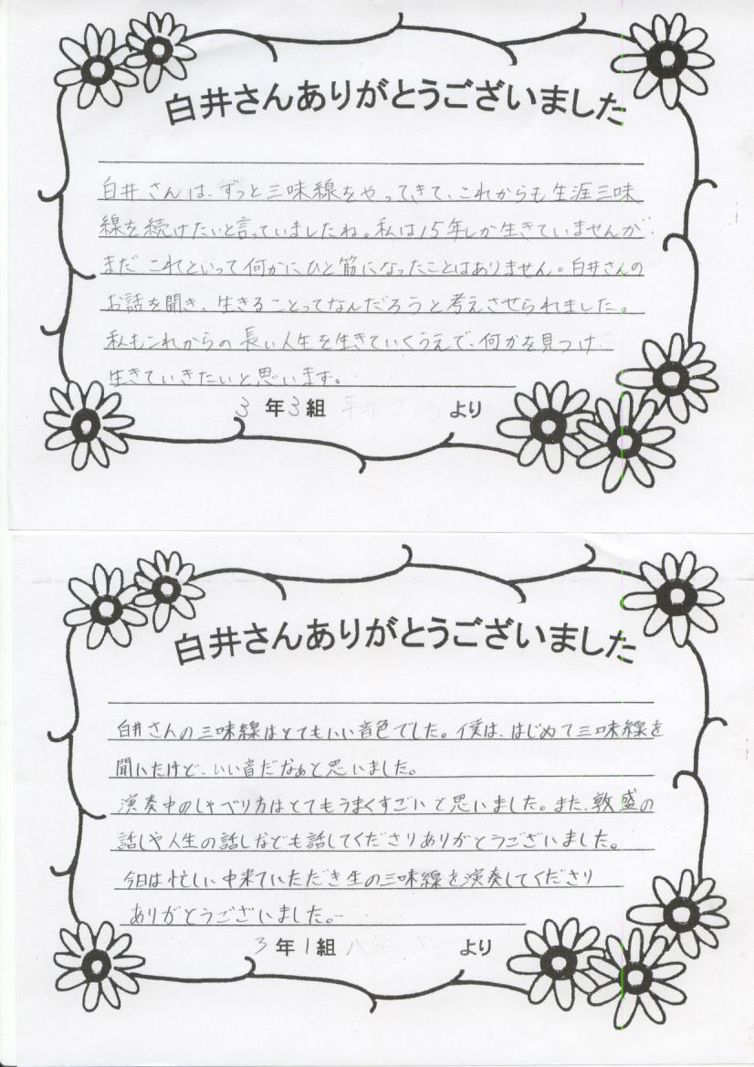 生徒さんからの手紙 生徒さんから勇気付けられるお手紙を頂きました。これはほんの一部ですが殆どがこの様に 感動して下さいました。特に一年生でもこれほどまで聴き入って感動してくれたことに、私も 大変驚き、感激致しております。 一年生からの手紙