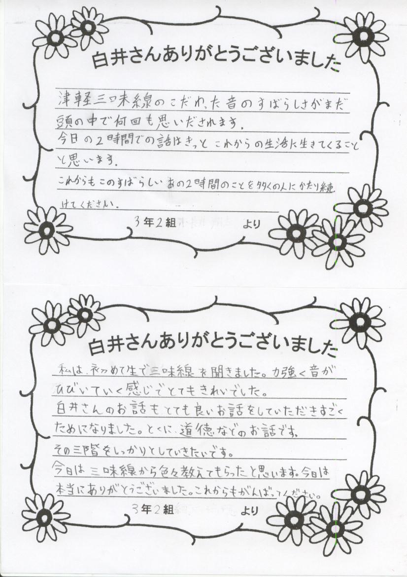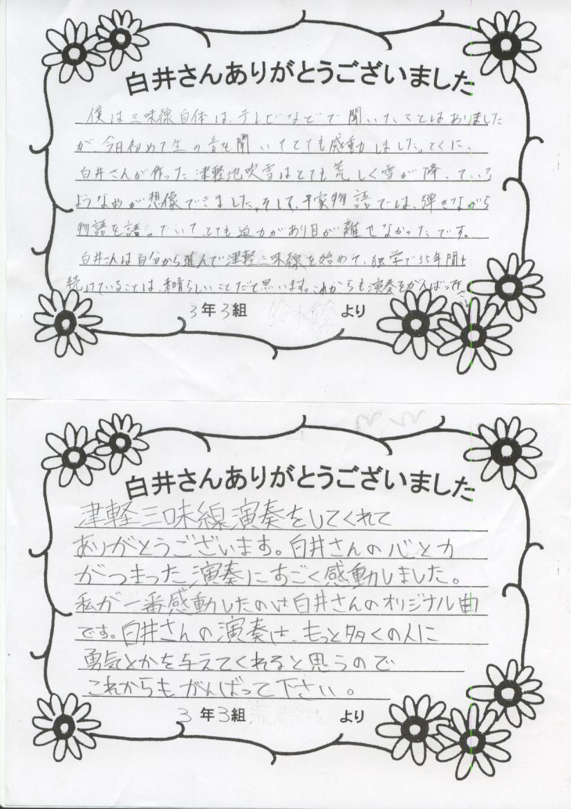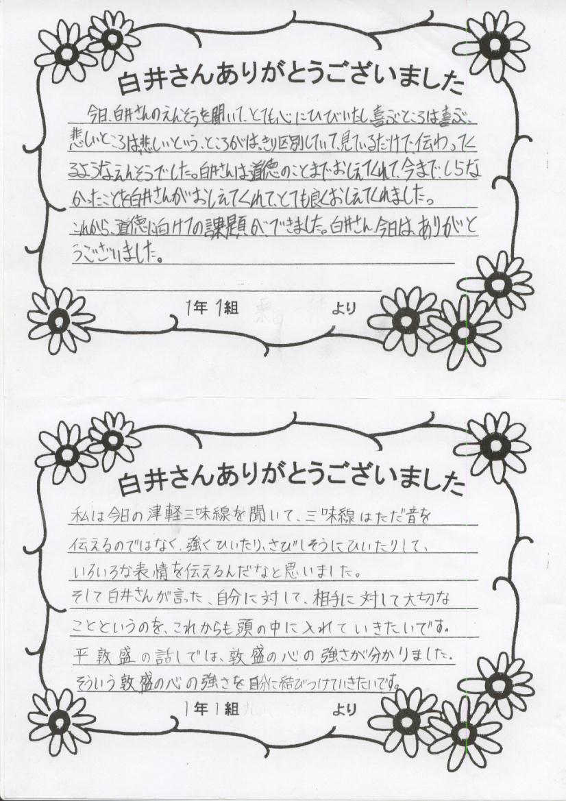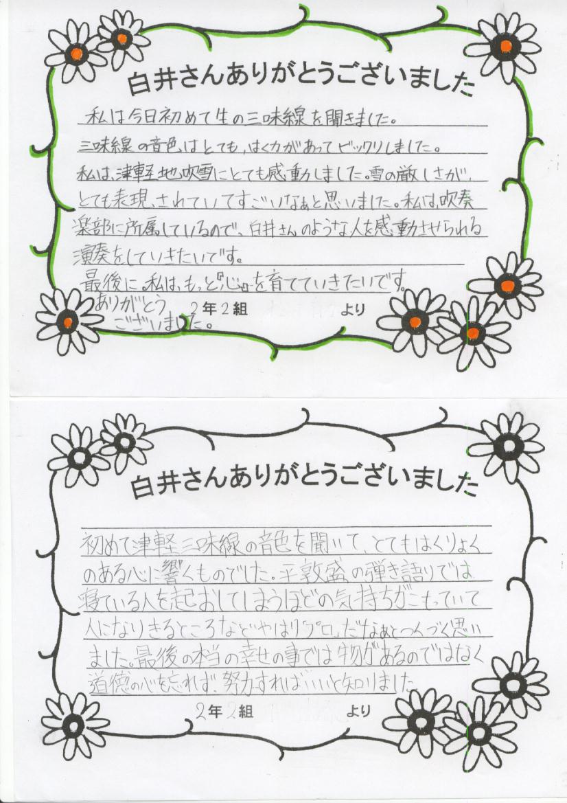 生徒さんからの手紙 生徒さんから勇気付けられるお手紙を頂きました。これはほんの一部ですが殆どがこの様に 感動して下さいました。特に一年生でもこれほどまで聴き入って感動してくれたことに、私も 大変驚き、感激致しております。 一年生からの手紙